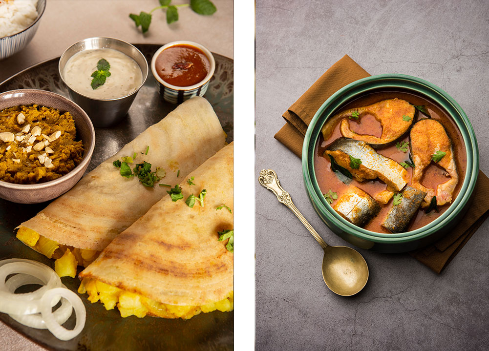 A popular breakfast dish, Appam is a soft, lacy pancake made from fermented rice batter. It pairs perfectly with a mildly spiced, creamy vegetable or chicken stew cooked in coconut milk, making it a comforting and delicious meal.